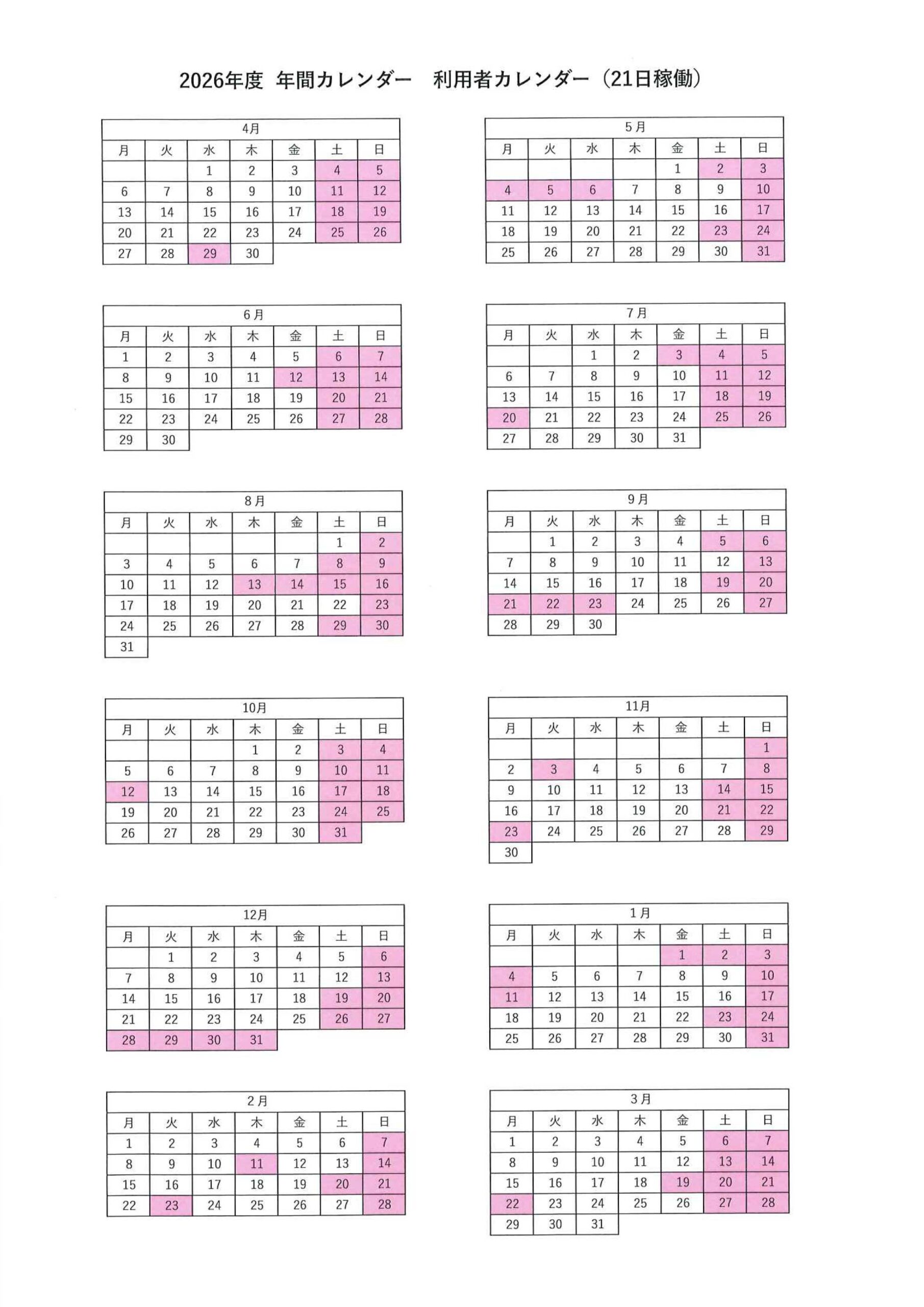 2026年度(2026年4月〜2027年3月)の営業日程を掲載いたしました。